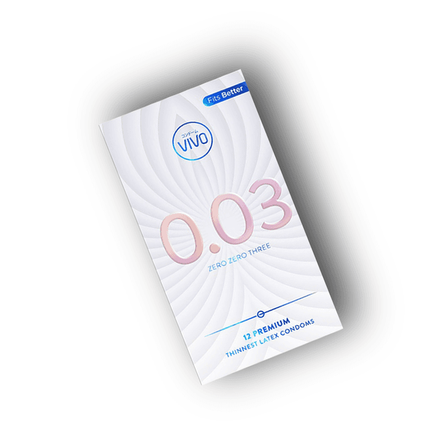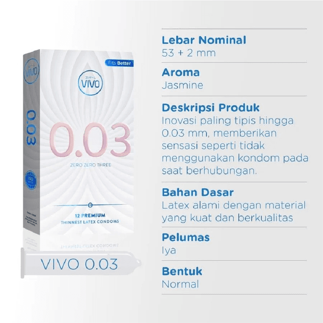 VIVO Kondom 0,03 yang terbuat dari bahan lateks juga ekstra tipis dan ekstra sensitif tidak mudah sobek ataupun bocor seakan tidak menggunakan pelindungan. Dengan ditambahkan pelumas yang beraroma jasmine yang dapat membantu menambah kepuasan dan tingkat sensitivitas selama berhubungan. Mencegah kehamilan dan penularan penyakit menular seksual Komposisi bahan: Lateks. Aturan Pemakaian: Pasang sebelum melakukan hubungan intim