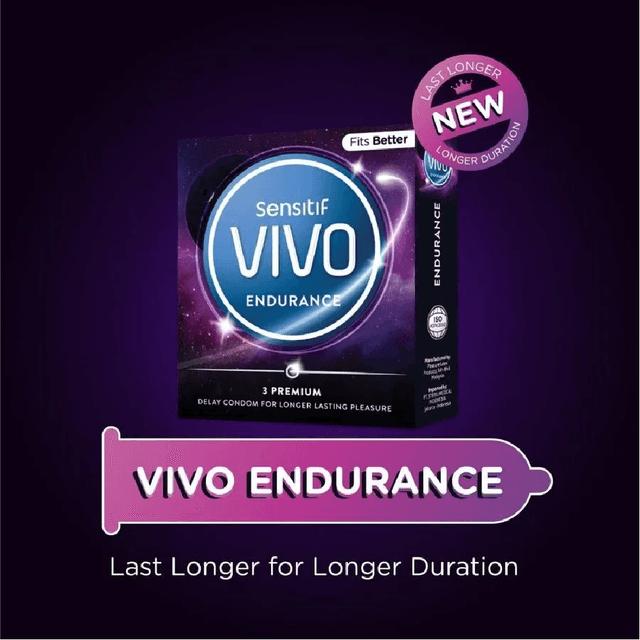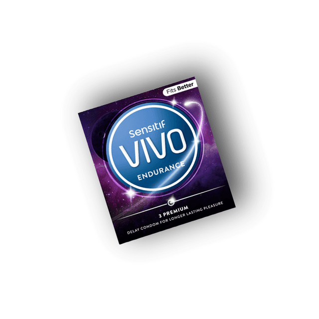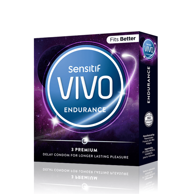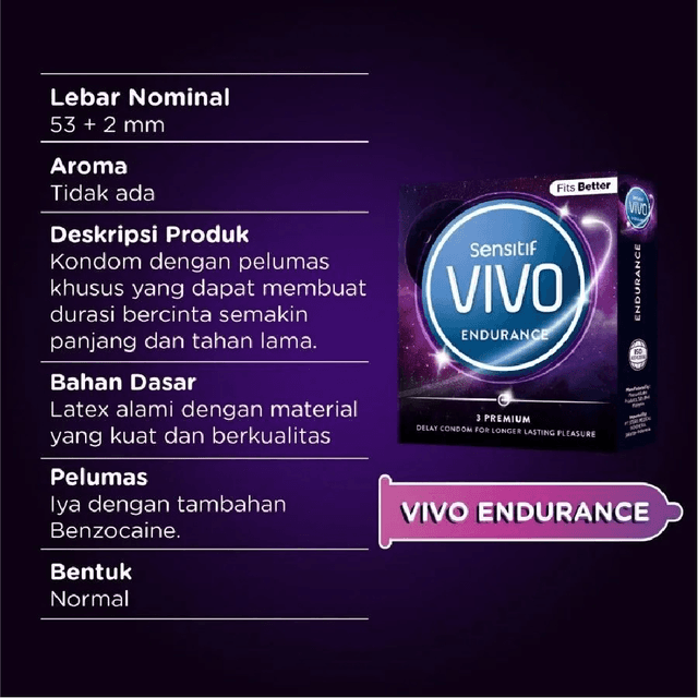 VIVO Endurance Condom yang mengandung pelumas khusus membuat anda menikmati dan membuat durasi semakin panjang (mengandung benzocaine 5%) terdapat di dalam permukaan kondom yang dapat membantu pria menambah durasi kesenangan bersama pasangan. Mencegah kehamilan dan penularan penyakit menular seksual Komposisi bahan: Lateks. Aturan Pemakaian: Pasang sebelum melakukan hubungan intim