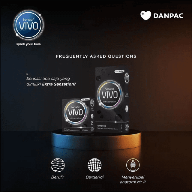 Vivo extra sensation memiliki tekstur bintik dan berulir, bentuk kepala kondom ini juga menyerupai kepala penis sehingga meningkatkan sensitifitas bagi pria. Mencegah kehamilan dan penularan penyakit menular seksual Komposisi bahan: Lateks. Aturan Pemakaian: Pasang sebelum melakukan hubungan intim
