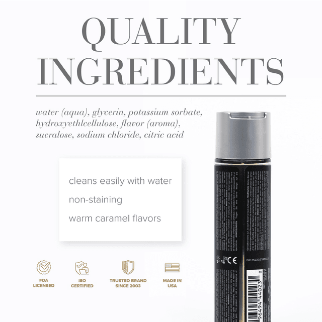 Meningkatkan kenyamanan saat berhubungan seksual. Varian dari Gelato Series dengan rasa Salted Caramel. Berbahan dasar air, Kandungan gliserin yang aman (dari selulosa tanaman / sawit), aman tertelan, bebas gula, bebas kalori, bebas bau, bebas warna, bebas noda, mudah dibilas, tidak lengket, aman untuk kulit dan bagian dalam, aman untuk kondom latex. Komposisi bahan: Pelumas berbasis air. Aturan Pemakaian: Oleskan pada alat kelamin sebelum atau selama aktivitas seksual untuk mengurangi iritasi dan area yang diinginkan