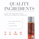 Meningkatkan kenyamanan saat berhubungan seksual. Varian rasa chocolate dengan bahan dasar air, kandungan gliserin yang aman (dari selulosa tanaman / sawit), kandungan gliserin yang aman (dari selulosa tanaman / sawit), aman tertelan, bebas gula, bebas kalori, bebas bau, bebas warna, bebas noda, mudah dibilas, tidak lengket, aman untuk kulit dan bagian dalam, aman untuk kondom latex. Komposisi bahan: Pelumas berbasis air. Aturan Pemakaian: Oleskan pada alat kelamin sebelum atau selama aktivitas seksual untuk mengurangi iritasi dan area yang diinginkan