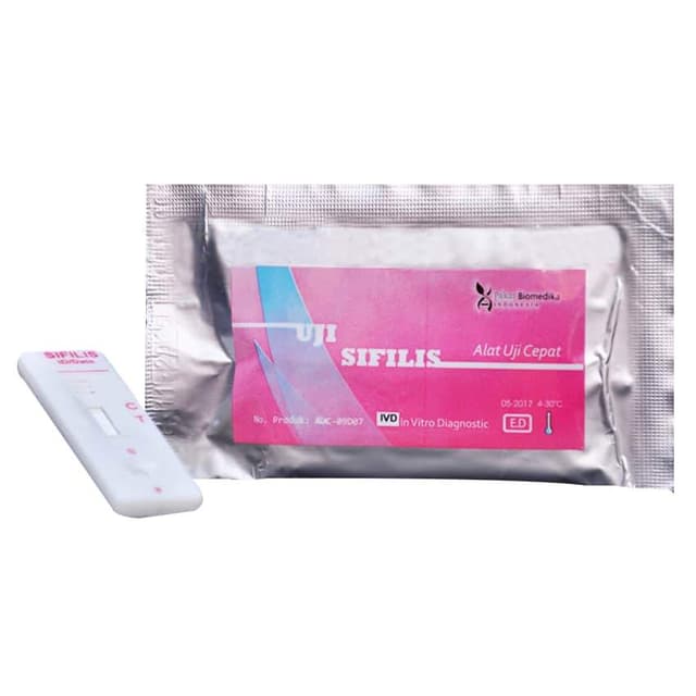 Alat Test Uji Sifilis dapat digunakan untuk mendeteksi keberadaan antibodi sifilis dalam darah, serum, atau plasma. Komposisi bahan: . Aturan Pemakaian: 1. Usapkan alkohol pada jari yang hendak di ambil darahnya 2. Tekan lancet sampai jari mengeluarkan titik darah 3. Sedot darah yang keluar menggunakan pipet plastik 4. Teteskan 1-2 tetes darah ke dalam lubang sample (S) 5. Teteskan 1-2 tetes cairan Buffer ke dalam lubang sample (S) 6. Tunggu hasil dalam 15 Menit (jangan membaca hasil setelah 20 menit)