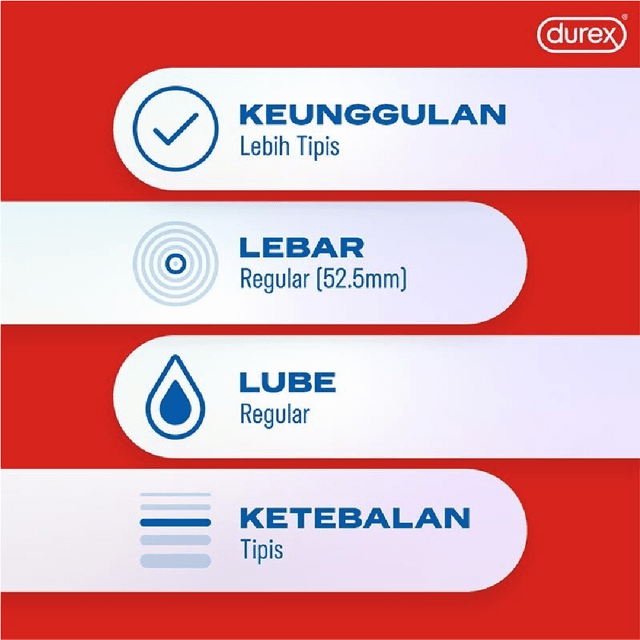 Kondom Durex Fetherlite lebih tipis untuk meningkatkan sensitivitas. Mencegah kehamilan dan penularan penyakit menular seksual Komposisi bahan: Latex Tipis. Aturan Pemakaian: Pasang sebelum melakukan hubungan intim